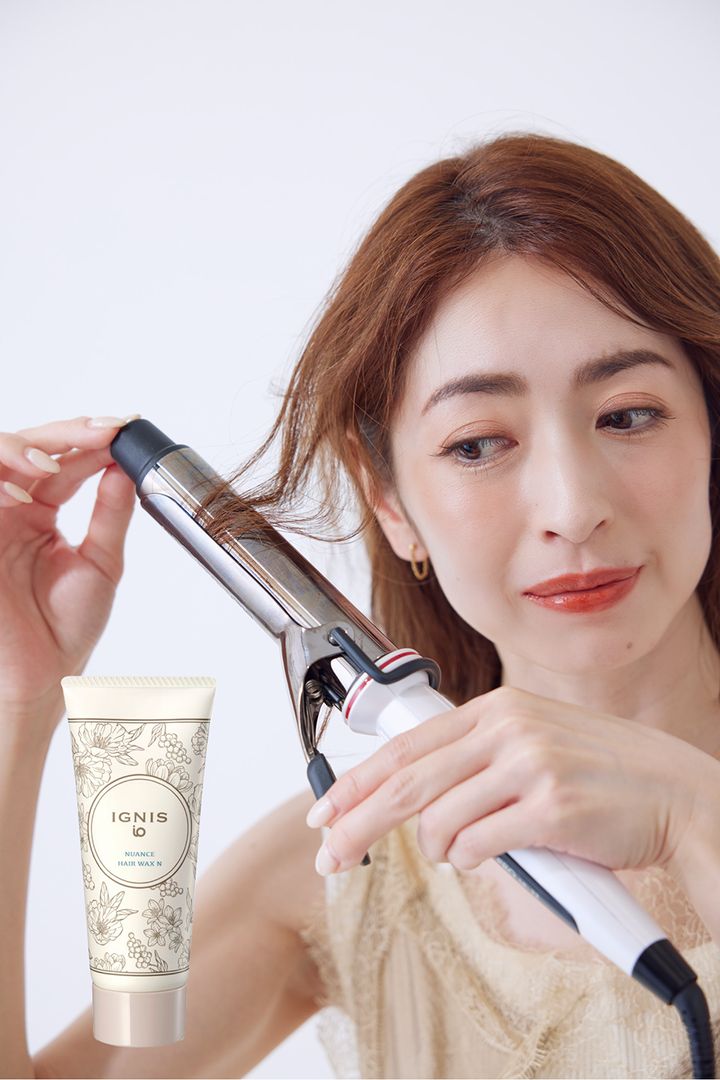 根元のクセ部分ははずして、32㎜のヘアアイロンで毛先のみ巻きます。リバースとフォワードを交互にしてふんわりと。仕上げにヘアワックスをなじませ、クセとカールをしっかり出して。