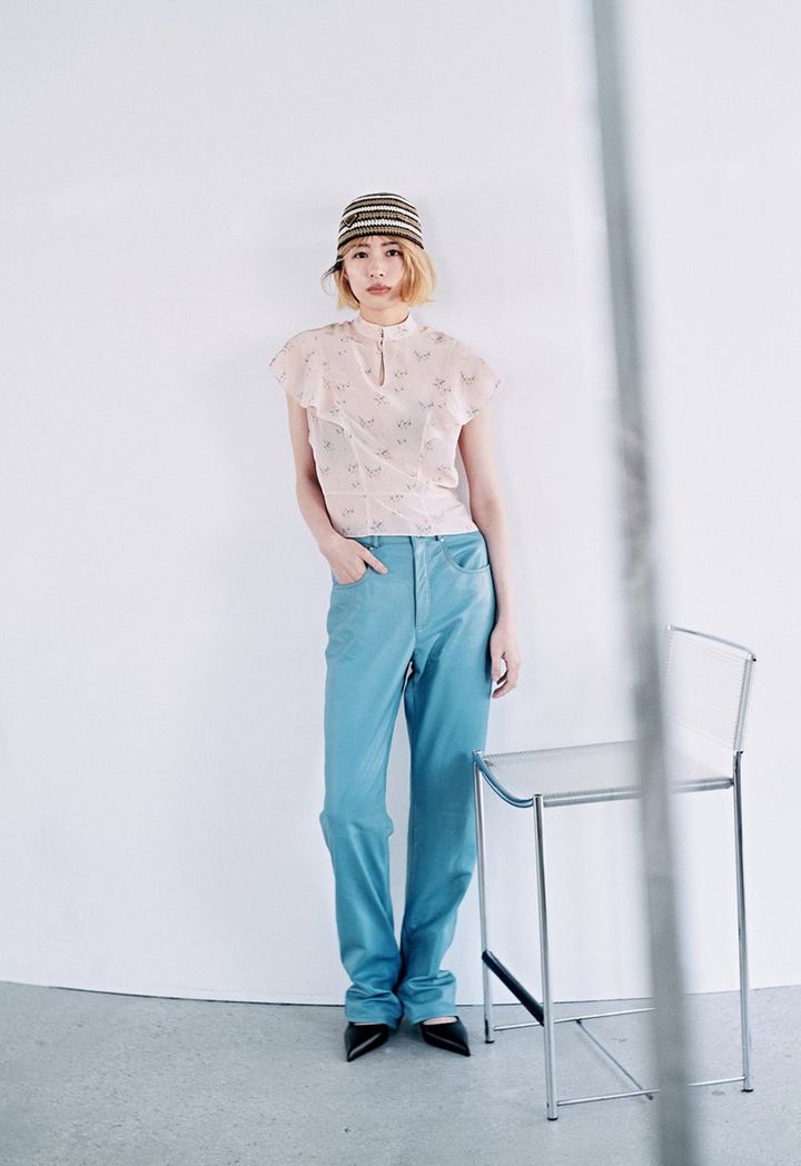 「なんて綺麗な色なんだろうと、一目で気に入ったレザーパンツ。ナチュラルなエイジング加工がされているんですが、そのリラックスしたムードもまた、レザーパンツを気張り過ぎない洗練されたものに見せてくれている気がします。シルエットも本当に綺麗。ライトブルーの色みも相まってデニムみたいな感覚ではけそう。こういうものこそ、欲しいときには出会えないから、出会えたタイミングで手に入れておかなくては! と思ってしまうんですよね」