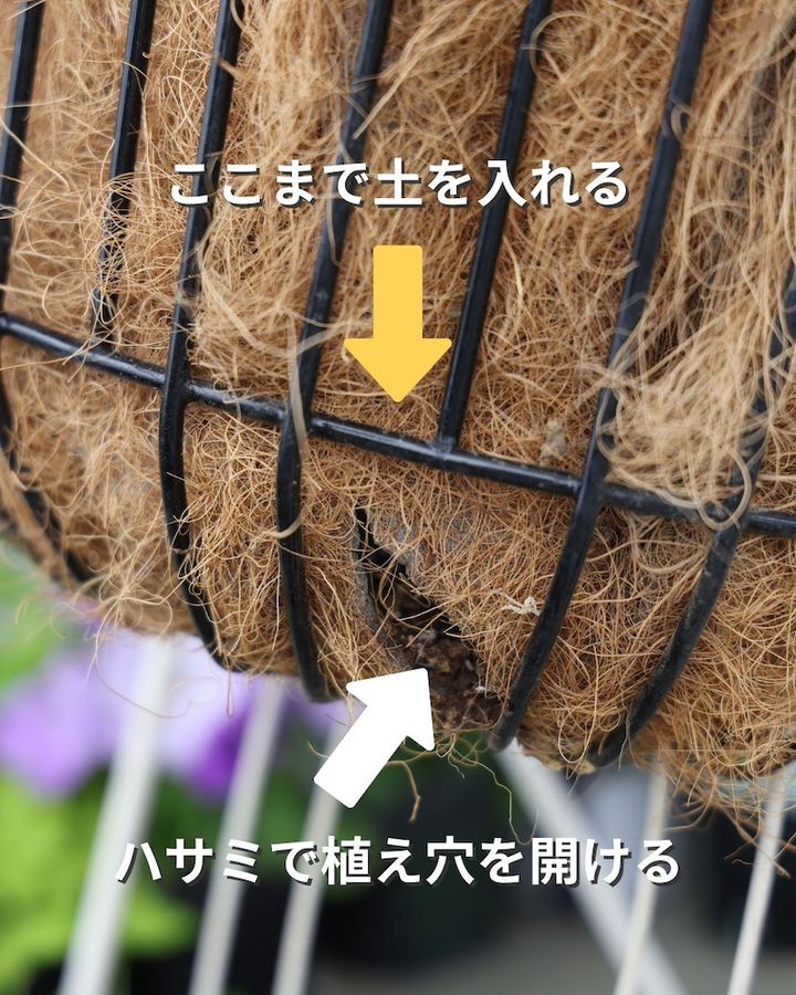 バスケットの下部にある横のラインくらいまで土を入れておきます。この横のラインより下の部分にはスリットがありませんが、ワイヤー間隔の広い箇所にも苗を植え込むと、仕上がりの形がキレイになります。ここにハサミで植え込み穴を開けておきましょう。