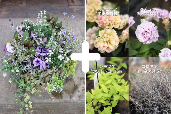 今回の一番の主役は、シックなパープルのペチュニア ‘ブルーベイン’。それに合わせて準主役には、ブルー&パープル系の小花のブルーデージーやスカエボラをセレクト。ブルー&パープル系の花を引き立てるのに最適なのは、捕色のイエロー。そこで、リーフ類に明るいライムイエローのものを選びました。このパープル&イエローの補色対比の花選びだけでも立体感が生まれキレイにまとまりますが、さらにニュアンスカラーのペチュニア ‘てまり珊瑚’やペチュニア ヴァンサンカンを主役に加え、繊細で複雑な表情をプラスしました。
