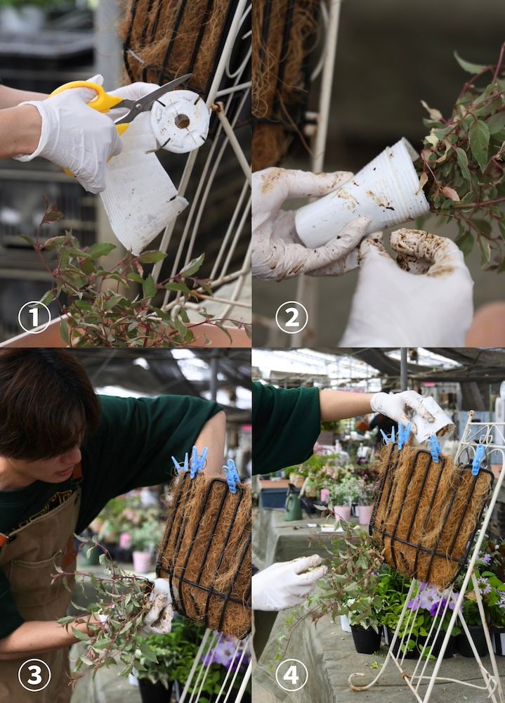 引っ掛けて作業すると下部に植物が入れやすく、制作しやすいです。壁やフェンスなど、ハンギングバスケットを飾る場所がない場合にもスタンドを利用して飾ることができます。