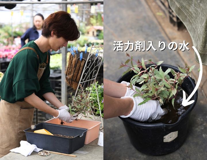 液肥と異なり、肥料やけなどの心配がない栄養剤です。植え込む際に根にダメージがあるため、活力剤につけながら植え込むことで回復力を促したり、根の活着をよくしたりします。