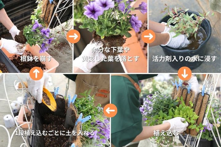 植生を意識して選びましょう。植物はそれぞれ適する環境が異なるため、日向を好む、湿った土壌を好むなど、できるだけ同じ環境を好む植物を組み合わせることで、長く美しくハンギングバスケットを楽しむことができます。