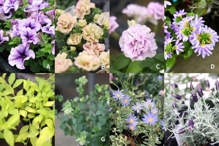 【準主役】(D)スカエボラ、(E)フレンチラベンダー、(F)ブルーデージーなど