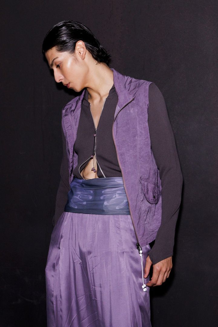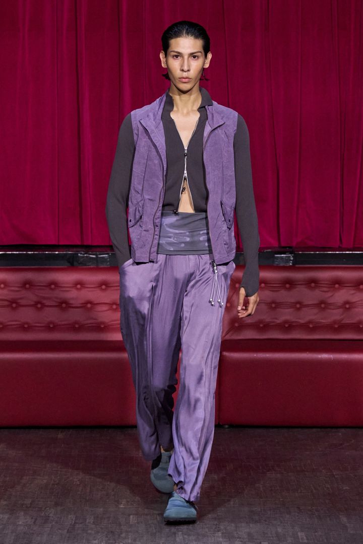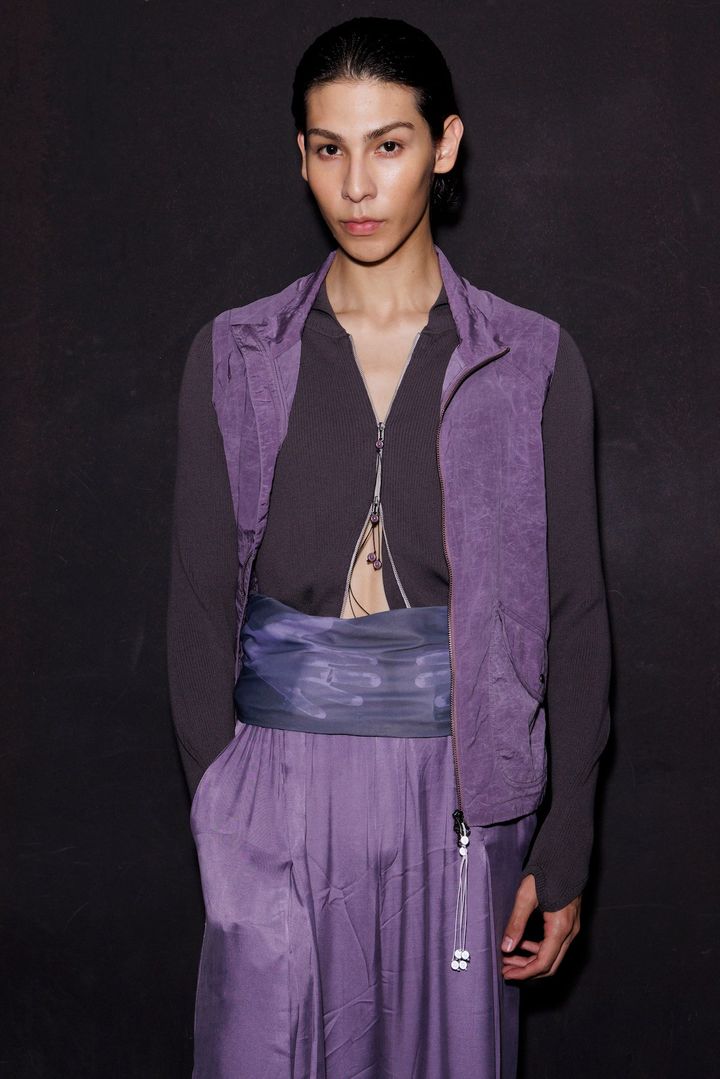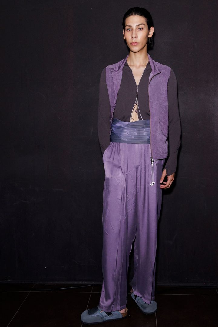 ロンドン発のブランド、サウル ナッシュ(SAUL NASH)のショーに登場したラウールは、柔らかい印象のラベンダーカラーのセットアップに身を包んでいた。インナーにはジップ式のトップを着用し、胸もととウエストをさりげなく覗かせていた。