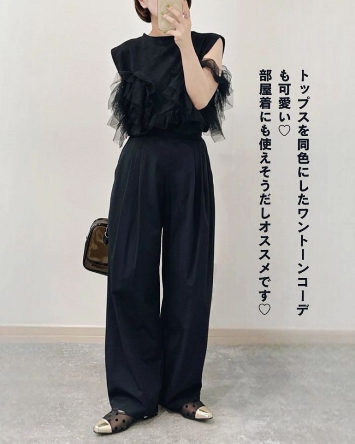 こちらは、ブラックのウルトラストレッチアクティブワイドパンツに、同色のチュールつきトップスを合わせたコーデ。靴も同色でまとめてあるため、大人っぽくシックな印象にまとまっています。