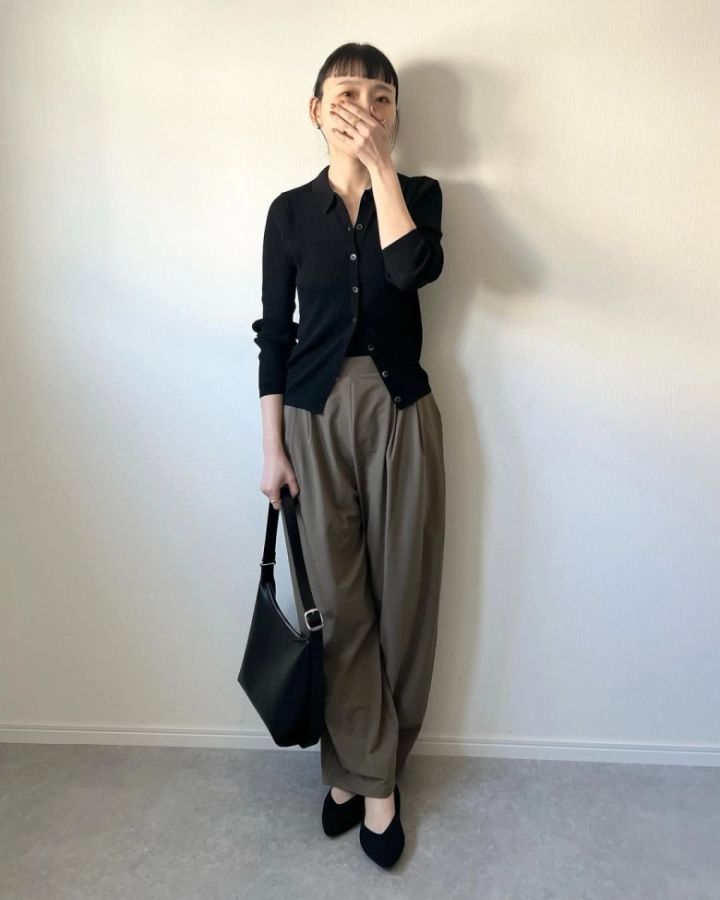 下半身にボリュームが出るウルトラストレッチアクティブワイドパンツに、ダークカラーのカーディガンを合わせた@ko.wearさん。襟によってきちんと感がプラスされ、オフィスカジュアルにもOKな着こなしに仕上がっています。