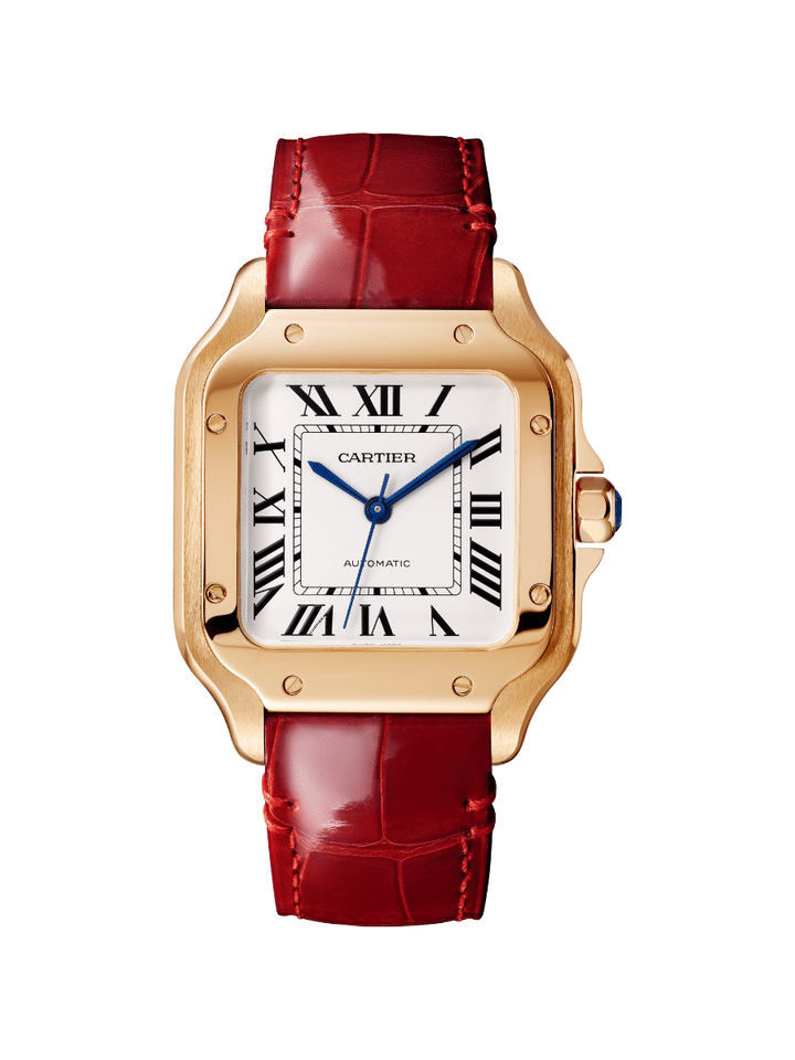 ゴールド×カラーアリゲーターストラップがエレガントな雰囲気。ウォッチ「サントス ドゥ カルティエ」MM〈35.1mm〉(PG×アリゲーターストラップ、自動巻き、交換可能なアリゲーターとカーフスキンのストラップ、10気圧防水)¥2,732,400 Antoine Pividori © Cartier