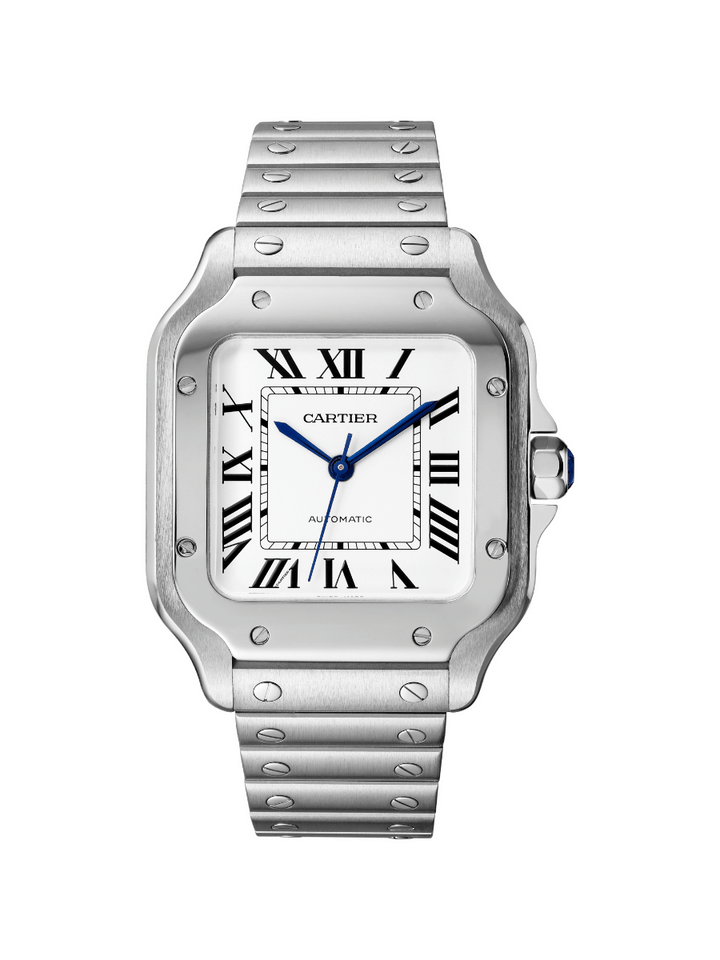 「サントス」の誕生は、今から100年以上前にさかのぼります。当時、上級階級の男性が身につける時計は懐中時計が一般的でした。そんななか、カルティエの3代目当主のルイ・カルティエは友人のブラジル人飛行家アルベルト・サントス=デュモンから“飛行中に時刻を確認したい”と相談を受けます。その想いにこたえる形で1904年に誕生したのが世界初の男性用腕時計「サントス」ウォッチ。そしてそれが、1911年に発表された「サントス ドゥ カルティエ」コレクションの前身となりました。また、それまで丸型が主だった懐中時計に対して、幾何学的なラインが特徴の角型ウォッチは革新的なものでした。