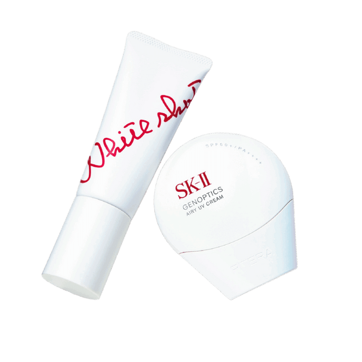 右から:ジェノプティクス エアリー UVクリームSPF50+・PA++++ 30g ¥9,900〈編集部調べ〉(SK-II )、ホワイトショット セラムUV SPF50+・PA++++ 45g [医薬部外品] ¥7,150(ポーラ)