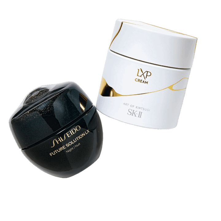 右から:LXP 金継ぎ クリーム 50g ¥68,200〈編集部調べ〉(SK-II) 、フューチャーソリューション LX トータル Rクリーム 50g ¥37,400(SHISEIDO)