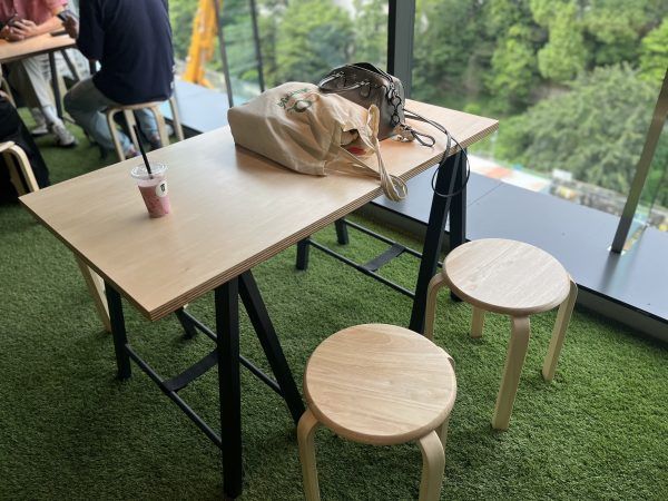 JR御茶ノ水駅を出て、すぐ横にあるエスカレーターを上がると、2階に「エキュートエディション御茶ノ水」があります。まだあまり知られていないと思うのですが、奥には、神田川を望むガラス張りのテラス席があって、誰でも自由に休憩ができます。このスペースが電車も眺められてなかなかいい!