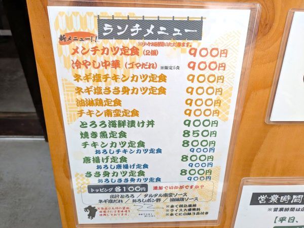 メニュー看板を見ると、定食です!定食やってます!800円から900円とお得な定食です。リーズナブルな価格設定がいいですね~。