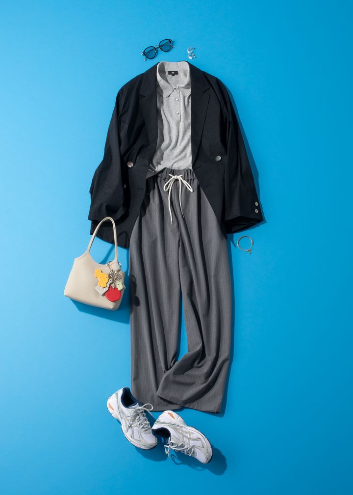 <晴れの日>ジャケットは着回し。ニット¥8,990(PLST)パンツ¥12,100(マルゥ)バッグ¥33,000チャーム¥5,500〜※ポップアップ限定販売(ともにヴァジック/ヴァジックジャパン)シューズ¥15,400(アシックス)メガネ¥39,600(ブラン)ピアス¥2,500(セネ)バングル¥2,000(シーテ)