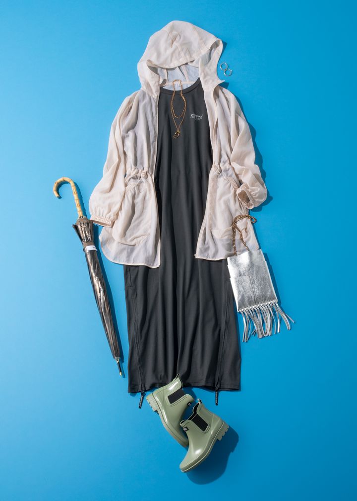<雨の日>パーカは着回し。ワンピース¥19,800(アメリカーナ×フリークス ストア/フリークス ストア)バッグ¥26,400(ノマディス)シューズ¥16,500(エーグル)ピアス¥77,000(モニス)ネックレス¥12,100(エイチアッシュ)傘¥2,860(Wpc.)