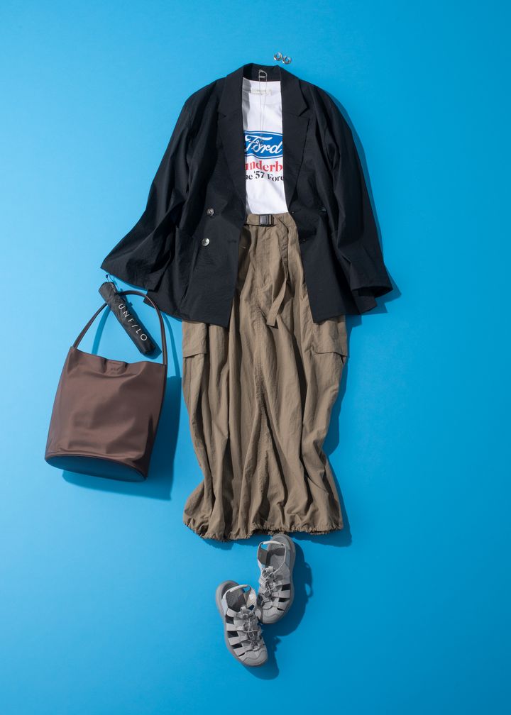<雨の日>ジャケットは着回し。Tシャツ¥5,995(フリークス ストア)スカート¥41,800(フィーニー)バッグ¥36,300(ロー ソウル)シューズ¥12,100(キーン)ピアス¥3,900(owol.)ネックレス¥1,800(シーテ)