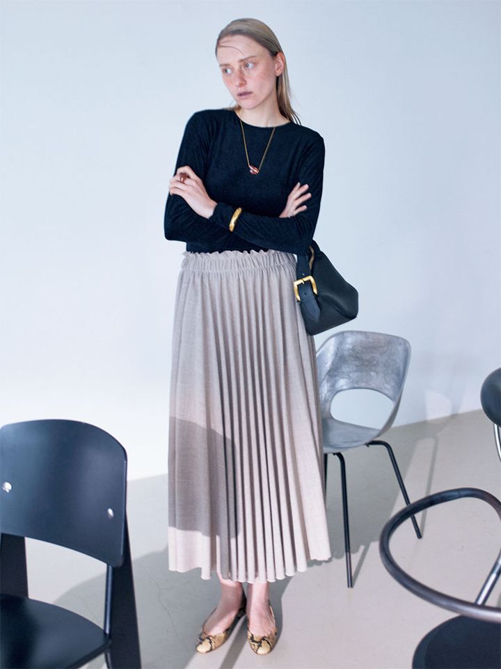 【POINT】縦に流れつつ、ほどよくボリュームも出るプリーツのシルエットのよさをシックに堪能。縦を意識できるスカートに細身のトップスを合わせて全体をすっきりと。スカートは幅の広い平ゴム仕様のウエストで窮屈さもなし。