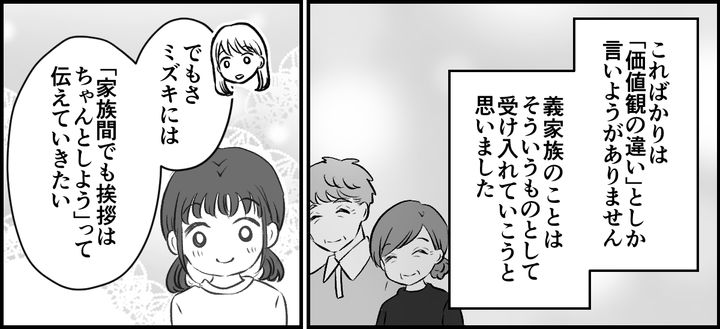 <義家族は挨拶しない!?>挨拶は基本じゃないの?夫と話して気づいた「価値観の違い」【まんが】