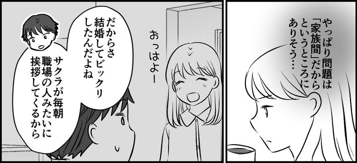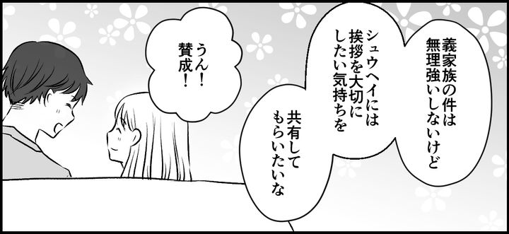 こうして私たちは今一度、「家族間での挨拶」に対する価値観を夫婦で共有することができました。義実家からの「家族として認めているから挨拶はしない」というのも親しみの表現のひとつですが、私は相手を知るためにもやはり挨拶は大切にしていたいです。