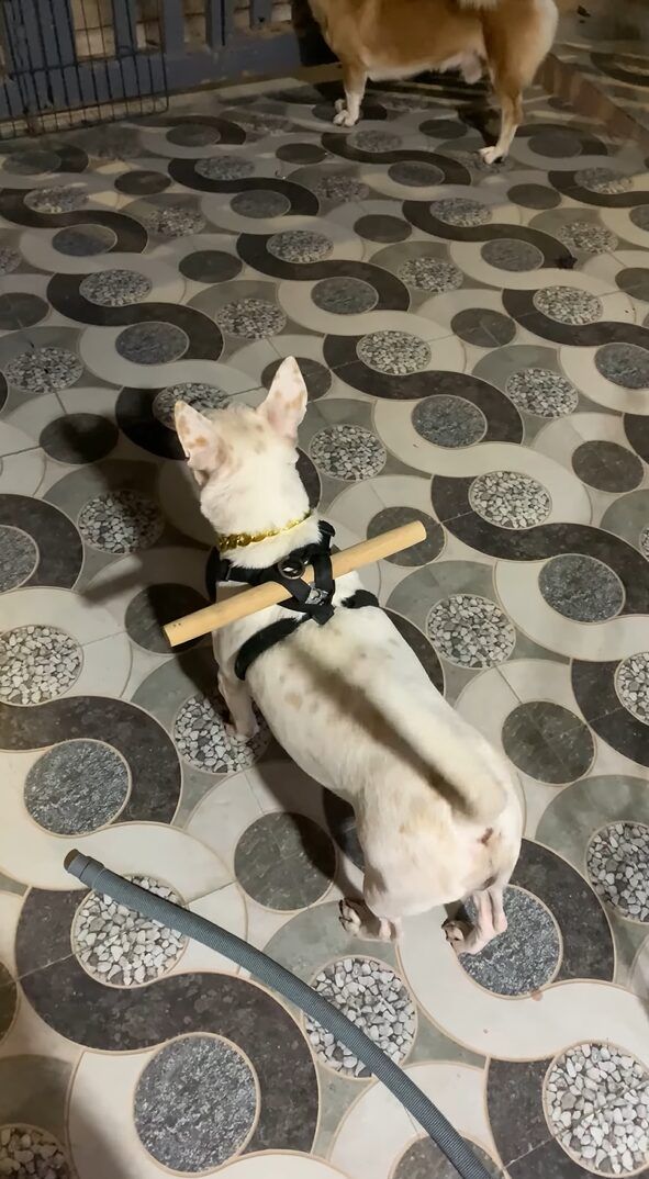 脱走癖のあるというイヌの背中には、なぜか棒が括りつけられていました。