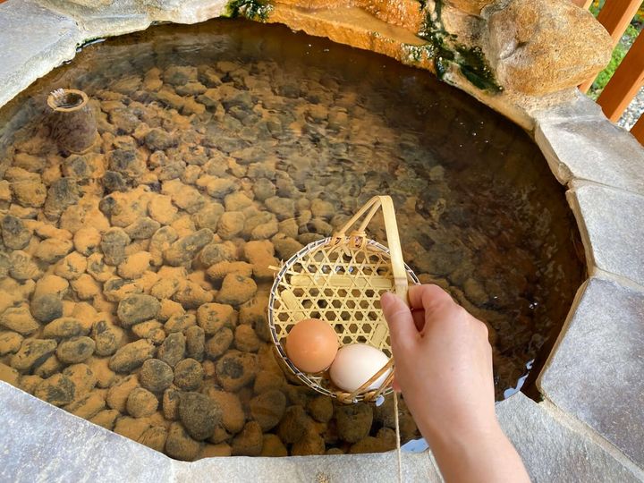 チェックイン開始時間の15時は、ちょうど小腹も空く頃。まずは温泉に入る前に、宿の名物である温泉たまごを作ってみましょう! 宿の入り口で湧き出る約70度の源泉に那須御養卵を投入したら、30~40分でできあがり。その間お風呂に入って、上がる頃にはちょうど食べごろに仕上がります。