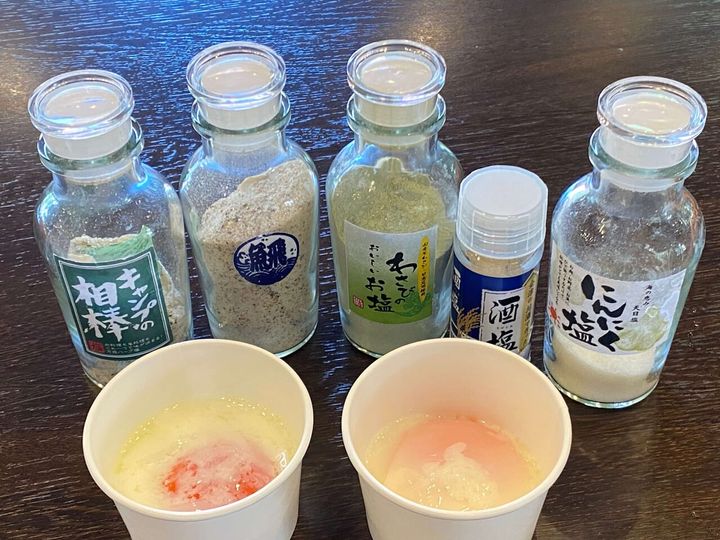 完成した温泉たまごは、多種多様に用意されたお好みの塩でいただいて。 出典: 美人百花.com