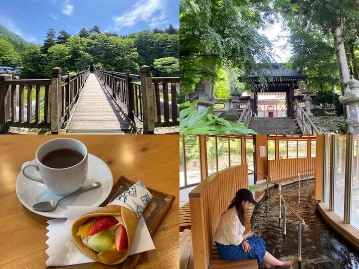 左上: 52.5mの「紅の吊り橋」は温泉がの名所のひとつ。右上:指定文化財の「妙雲寺」。 左下:ご当地グルメ“とて焼き”がいただける「くだものやカフェ 藤屋」。右下:プチ湯治の締めくくりは「湯っ歩の里」で。 出典: 美人百花.com