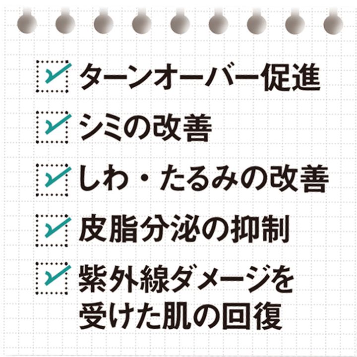 レチノールには、皮膚のヒアルロン酸の産生を促進する効果もあるので、皮膚のシワ予防やハリ改善につながるといわれます。長く使い続けた方が効果的です。