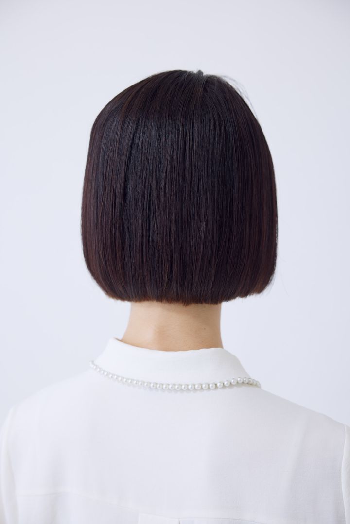 襟足を短く切っているため、表面にレイヤーを入れたり、削いで軽くしたりせずに形がきれいにまとまります。ドライヤーで乾かすだけでこのシルエットがラクラクに。