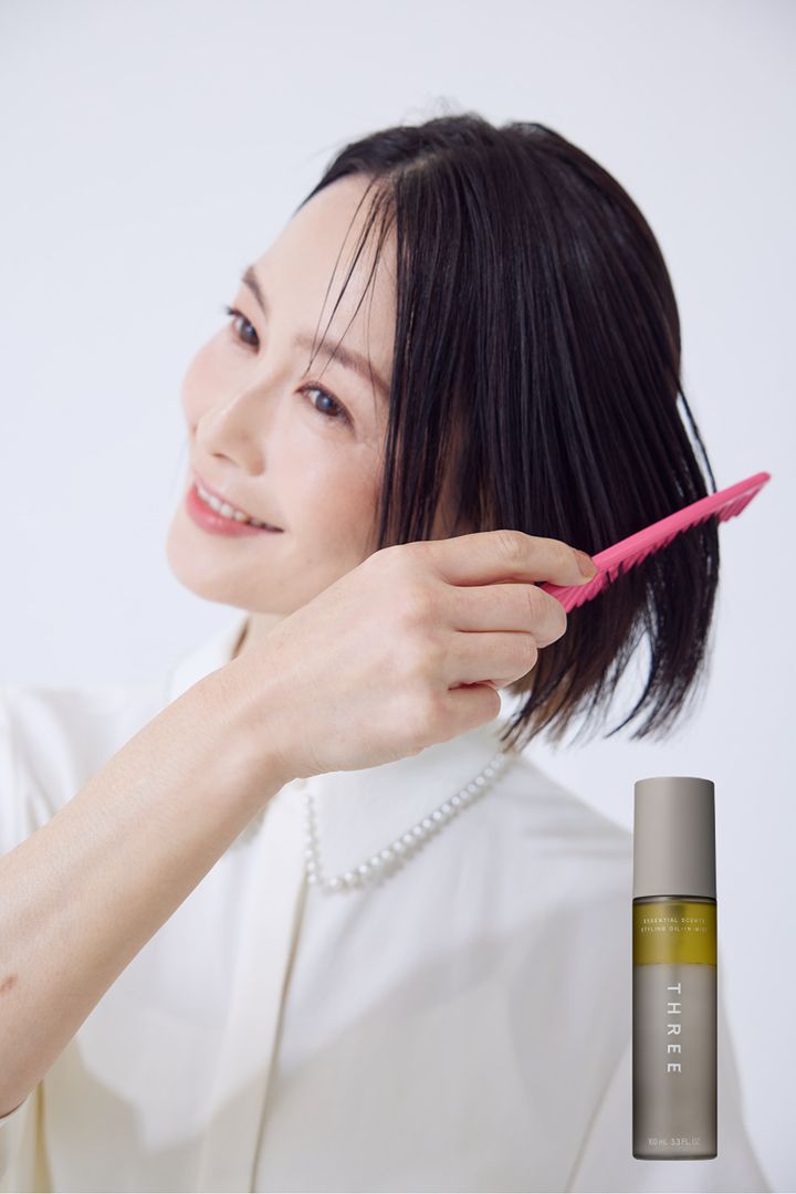 スタイリングは本当にとても簡単。ミストをシュッと全体にスプレーして粗めのコームで梳かすだけ。イヤリングカラーを見せるように、左右どちらかを耳かけして完成です。