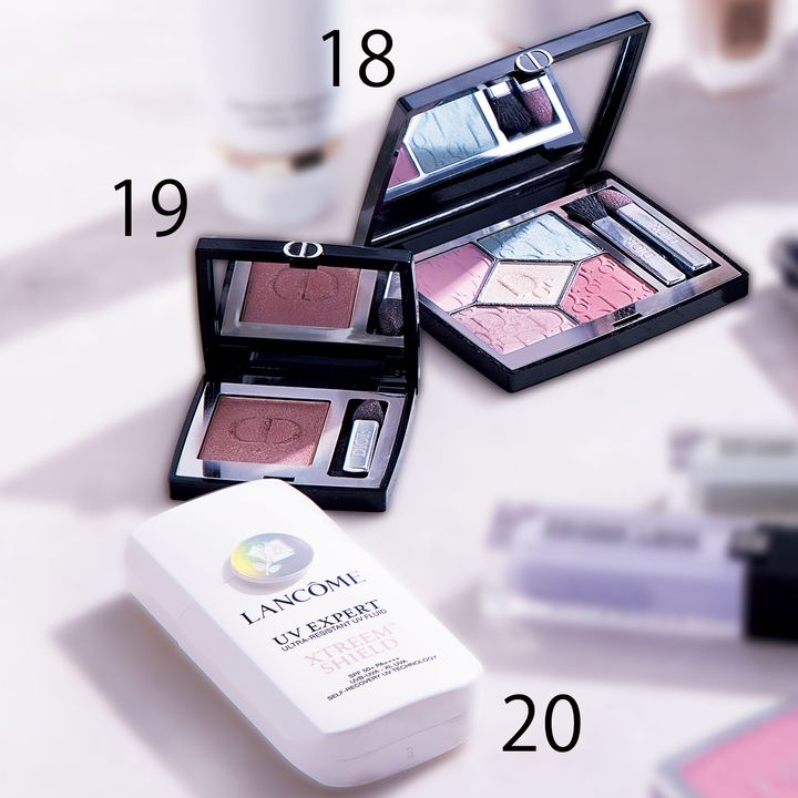 18おめかしの日のアイメイクに!ディオールの限定812はベビーピンク×ミントグリーンで可愛い目元。19赤みブラウンが大人の色気をプラス。ディオールのモノ クルール 755はオシャレブラウン。20軽い質感&ツヤのMyベストUV。ランコムの新作UVはSPF50なのに美容液のよう!