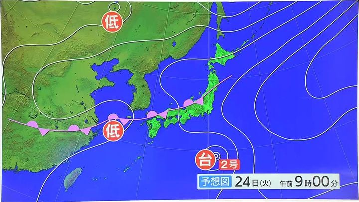 きょう23日(月)の9時に南海上で台風2号が発生しました。今後、北上してあさって水曜には関東の南、伊豆諸島周辺で熱帯低気圧に変わるため、北海道への影響はなさそうです。そして、本州方面には梅雨前線がありますが、北海道は前線の北に位置しています。
