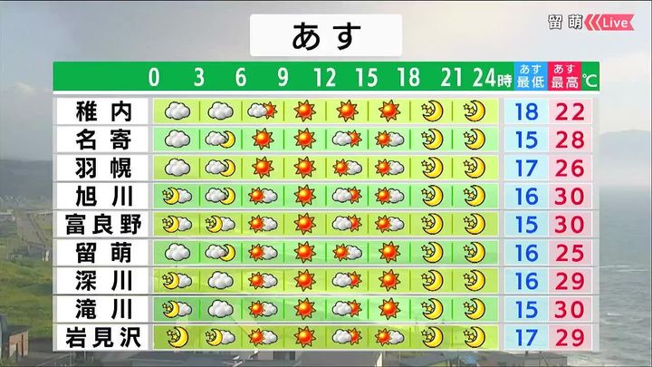 朝から日差しが強いでしょう。午後は夏の入道雲がわき立ちますが、天気の崩れはなさそうです。旭川や富良野、滝川でも30度まで気温が上がります。こまめな水分補給や食品の取り扱いにも注意して下さい。