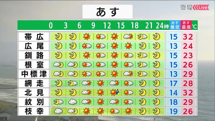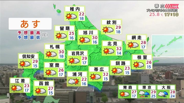 きょう23日(月)は日差しが少なめでしたが、あす24日(火)は晴れて最高気温はきょうより5度高い32度。帯広では今年一番の暑さになりそうです。
