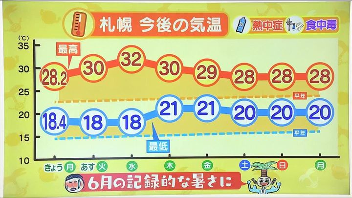 夏の高気圧の勢力が強く、あす24日(火)から3日連続で30度以上の真夏日。札幌では6月としては観測史上初めてのこととなりそうです。特に水曜は32度予想です。実はこの時期の平年は、23度くらいなんです。いかに異例の暑さかということが分かりますよね。最低気温も20度くらいで週の後半は寝苦しさが増すでしょう。熱中症や食中毒に今週も注意して下さい。