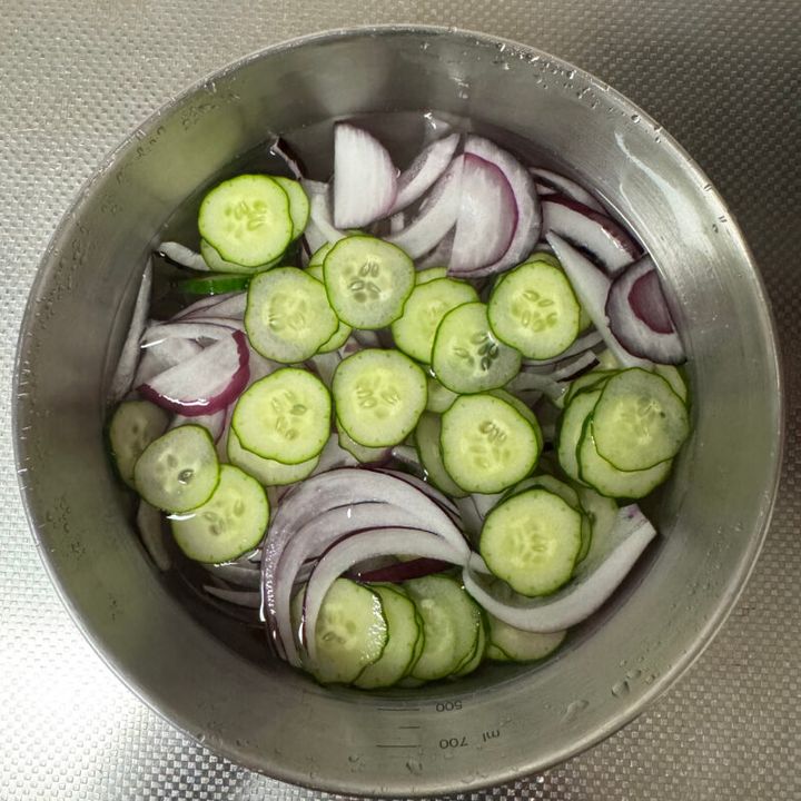 ① 玉ねぎときゅうりは薄切りにし塩水にさらしておく。