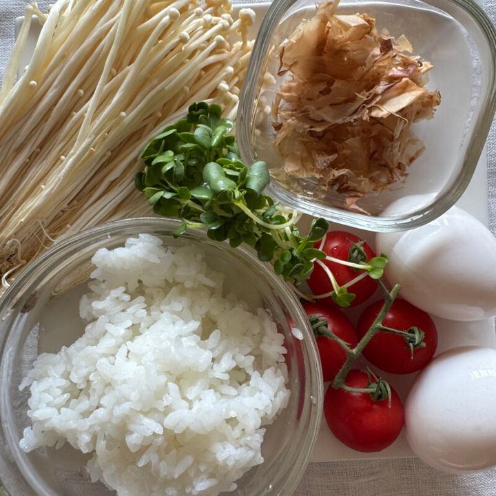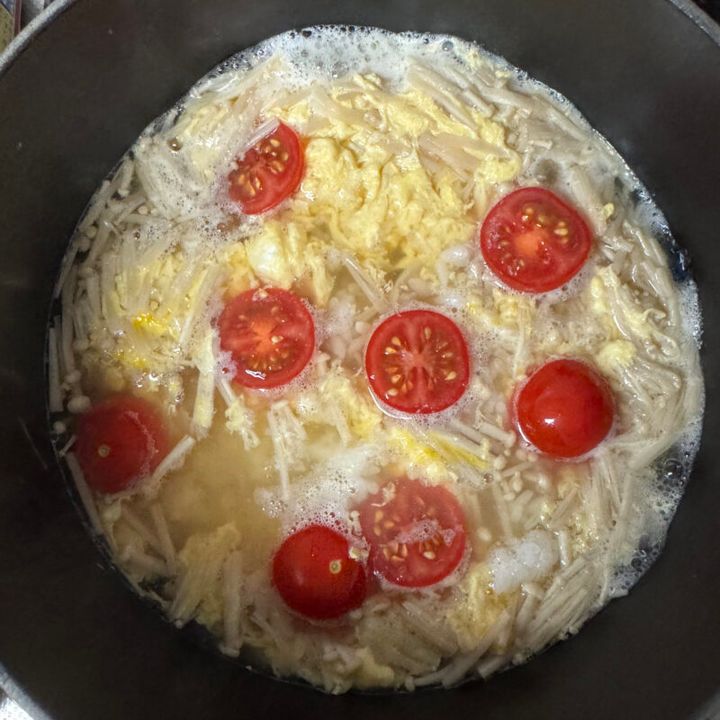 ④ご飯とえのきたけ、ミニトマトを入れ煮る。