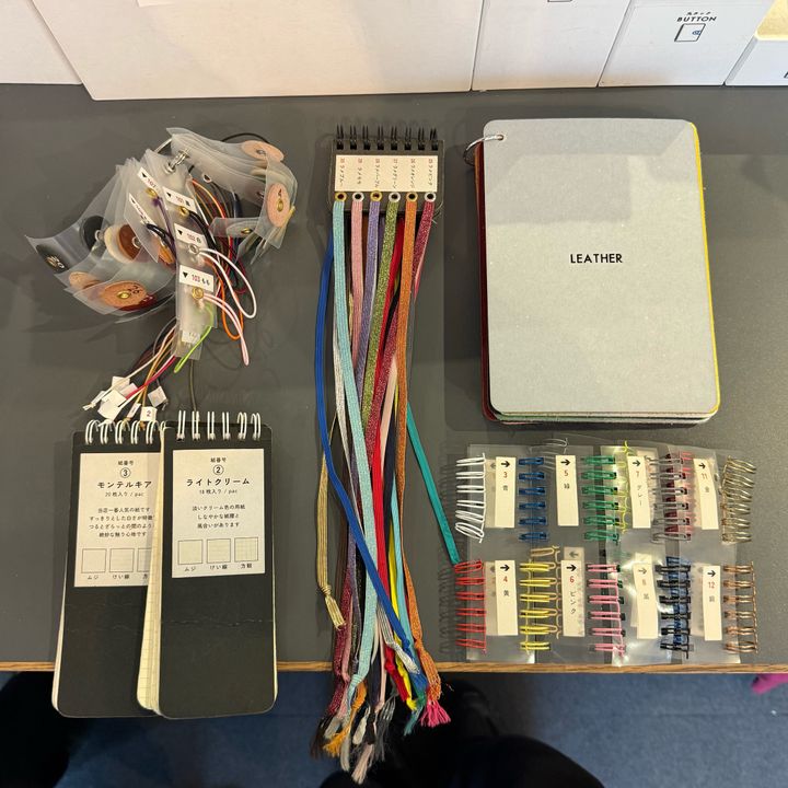 手順は、各席に置かれている各パーツの色・素材見本をもとに自分の好みを選択し、オーダーシートに記入していくカスタムオーダー方式。