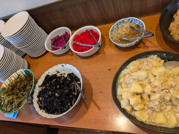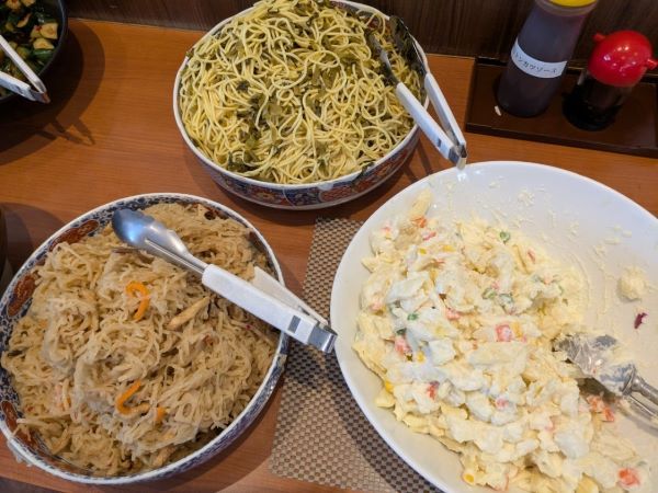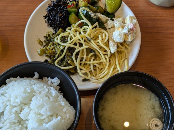 お肉がたっぷり入った「じゃがいものそぼろ煮」、「ひじきの煮物」、「高菜」に加え、お漬物まであります。さらにご飯が食べ放題なのですから、驚愕です。
