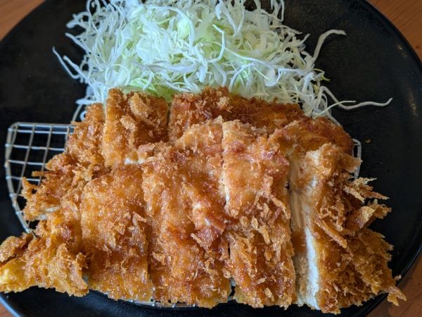 今回は「チキンかつ定食 『300g』」(990円)を注文して、娘とシェアすることにしました。とんかつは160~200gですが、チキンは300gもあるんです。「おそうざい定食」(800円)という「惣菜・ご飯・みそ汁食べ放題」というメニューがあるので、それも注文。”大人と子ども”や、少食2人組で訪れた時にも、助かります。 大きくて分厚くて見るからにサクサクのカツ!