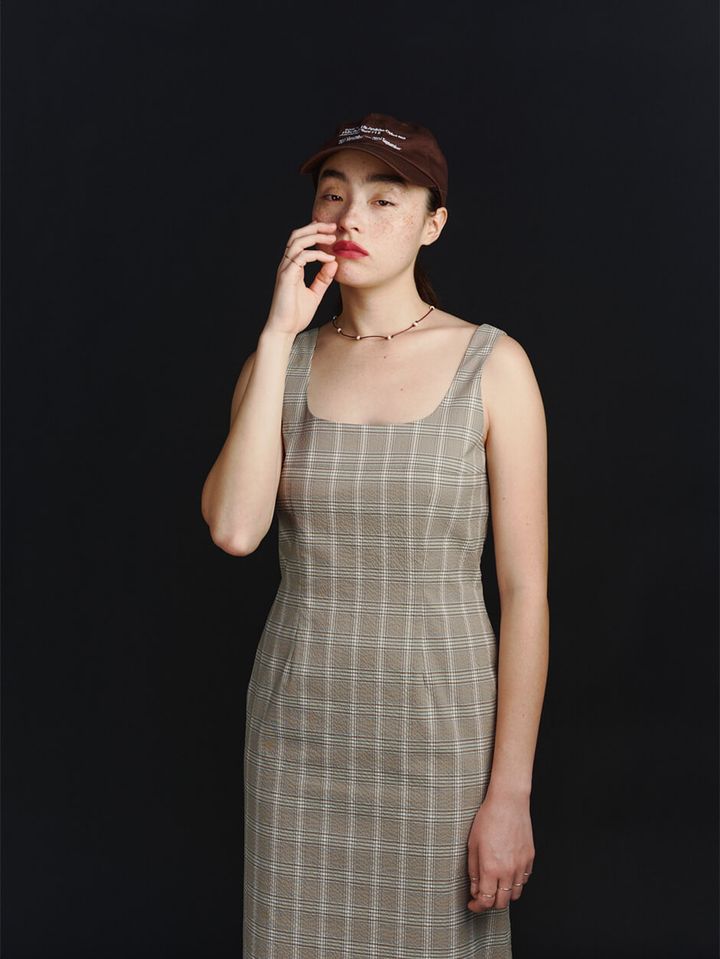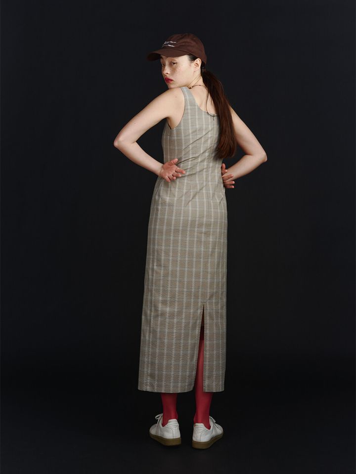 先染めのサッカー生地を使用したドレス「Squareneck Pencil Dress」は、首元をすっきり見せてくれるスクエアネックと女性らしいタイトなシルエットが特徴。