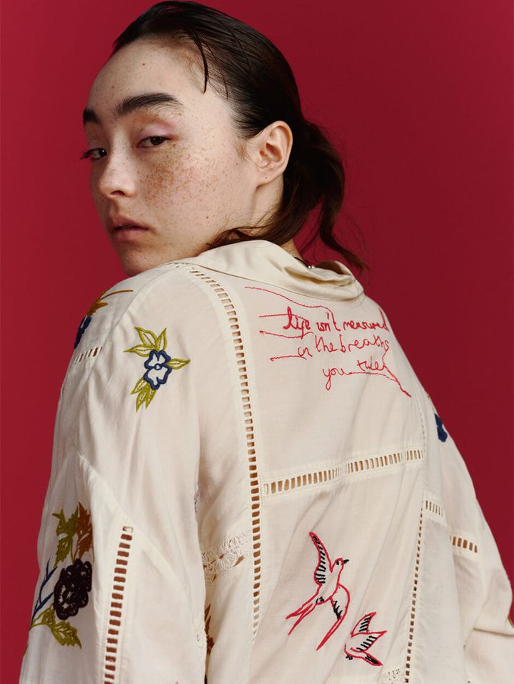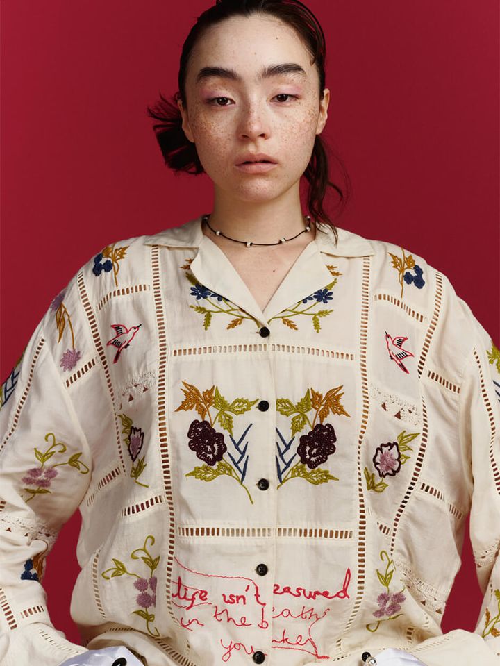 13種類もの刺繍があしらわれた開襟シャツ「Embroidery Patchwork Shirts」は、柄の配色や袖口のディテールなど細部にまでこだわったアイテム。