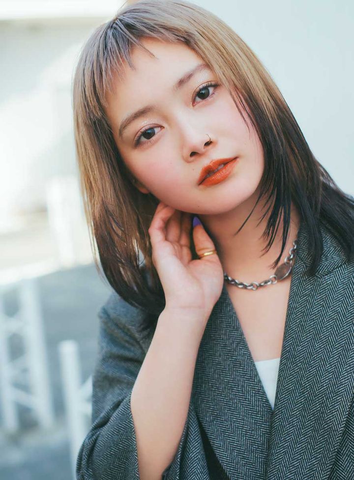 髪色はシックだけど、しっかり攻めた個性派長めボブ。顔まわりにハイレイヤーを入れ、前髪はオン眉2㎝×ザクザクのベビーバングに。全体をブリーチ後、クリーミーベージュでカラーし、毛先にのみ暗めのチェスナッツブラウンのエンドカラーをオン。少量のバームとオイルを混ぜて、バサッとドライな仕上がりに。