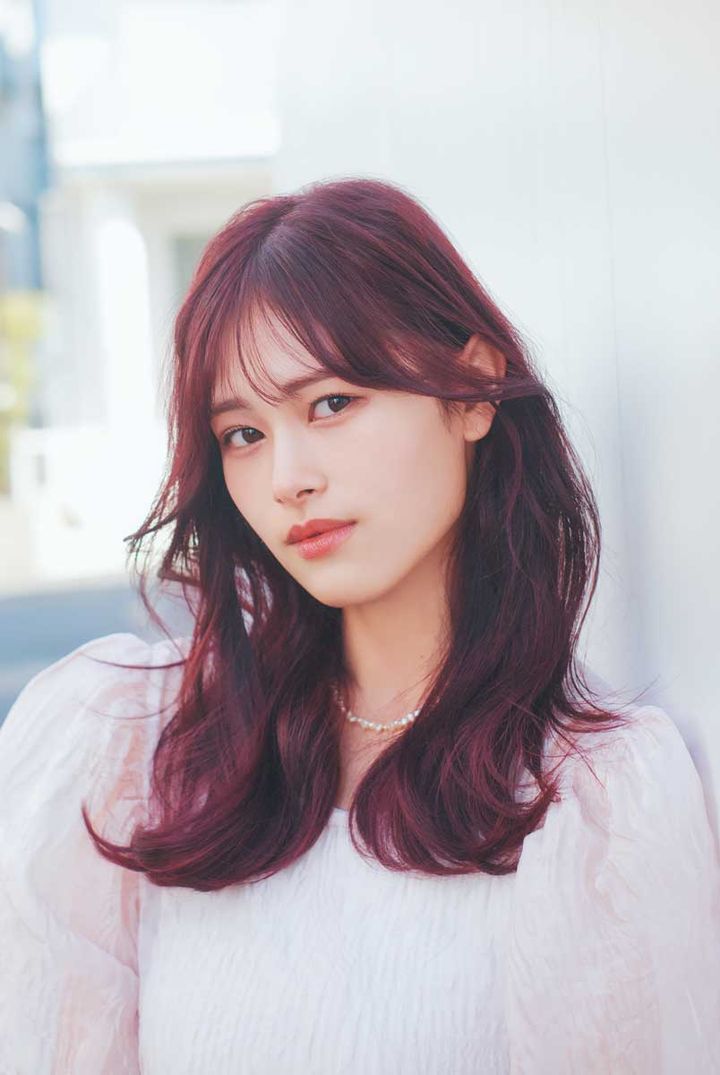 ゆるやかなカールが重なるシフォンのような軽快ロング。顔まわ りに流れるような毛束をつくり、全体的にレイヤーを入れて軽さ をプラス。ハチ上は外巻き、ハチ下は外巻きから始まるウエーブ で無造作な動きに。日差しに映えるピンクカラーもときめき度抜 群。ラベンダーが入っているから、色落ちしても可愛い。