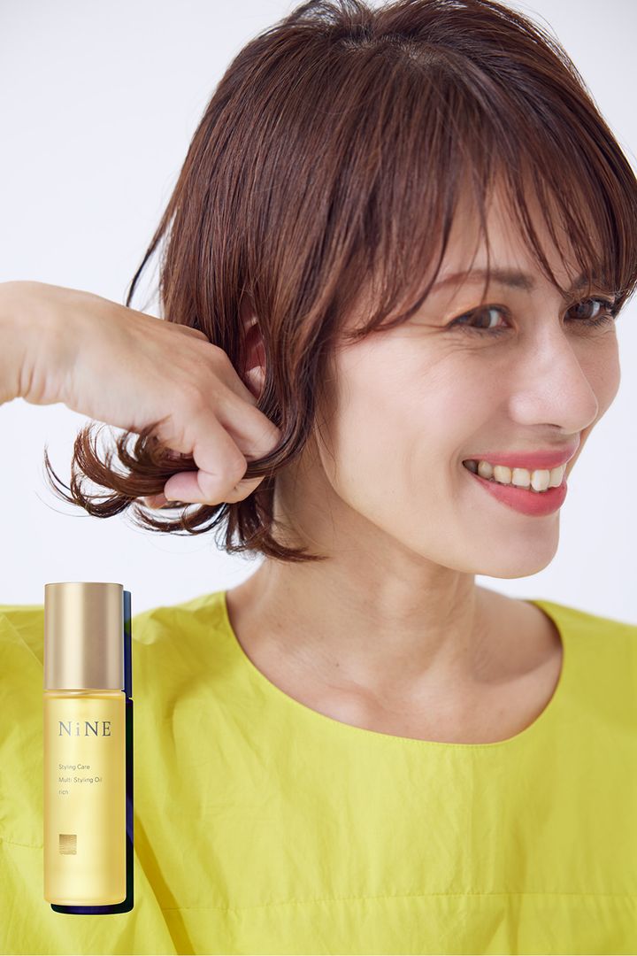 しっかりとしたウェット感を与えながら、指通りのよい軽やかな仕上がりに。NiNE マルチスタイリングオイル リッチ 100mL ¥3,740/ホーユー(TEL 0120-416-229)