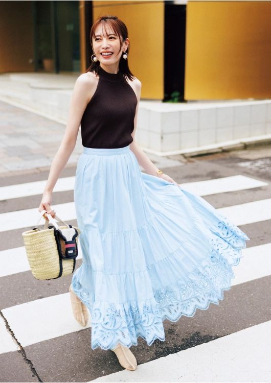 こなれたイメージのアースカラー。優しげなパステルカラーを合わせると、ガールな私たちにちょうどいい、ほどよい甘さと着映え感に着地!シーズンムード高まるカットワークレースの水色スカート。リッチ感のあるブラウンタンクとのコンビで大人可愛く。