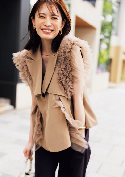 チュールをあしらったベージュジレで、可愛さとこなれ感を両立。ブラウンパンツを合わせて全体をなじませると、ニュアンスが生まれてさらにしゃれ見え。白バッグで抜け感を加えて、夏らしい軽やかさもプラス。
