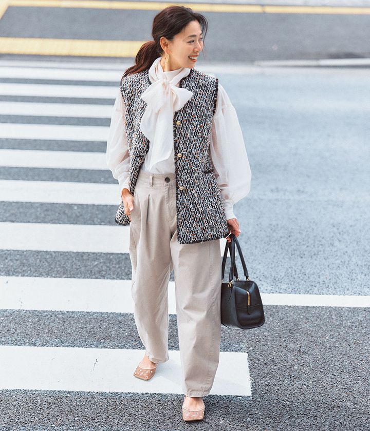 シアーで今季らしくアプデ!構築的なパンツでツイードジレもスタイリッシュ。