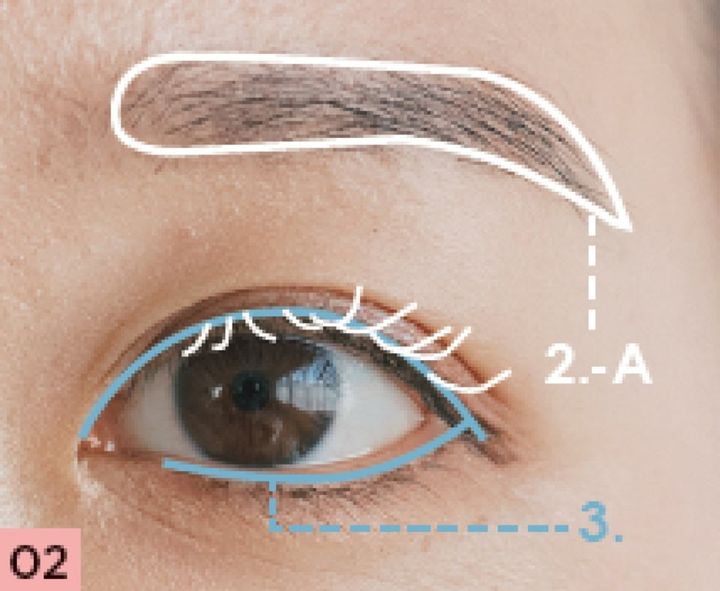 3のラインで目頭下だけあけてキワを囲み、5 のマスカラは上まつ毛だけに塗る。眉は2-Aでほわっとぼかしながら描き、眉尻は少し長く描く。
