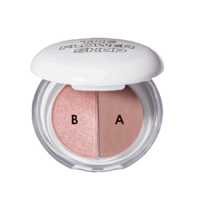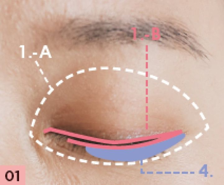 1-Aを上下まぶたを囲みながら横長アーモンド状にのせ、1-Bを目頭下だけあけキワに細く囲みのせ。4は下まぶた目尻側2/3のキワに太めに。